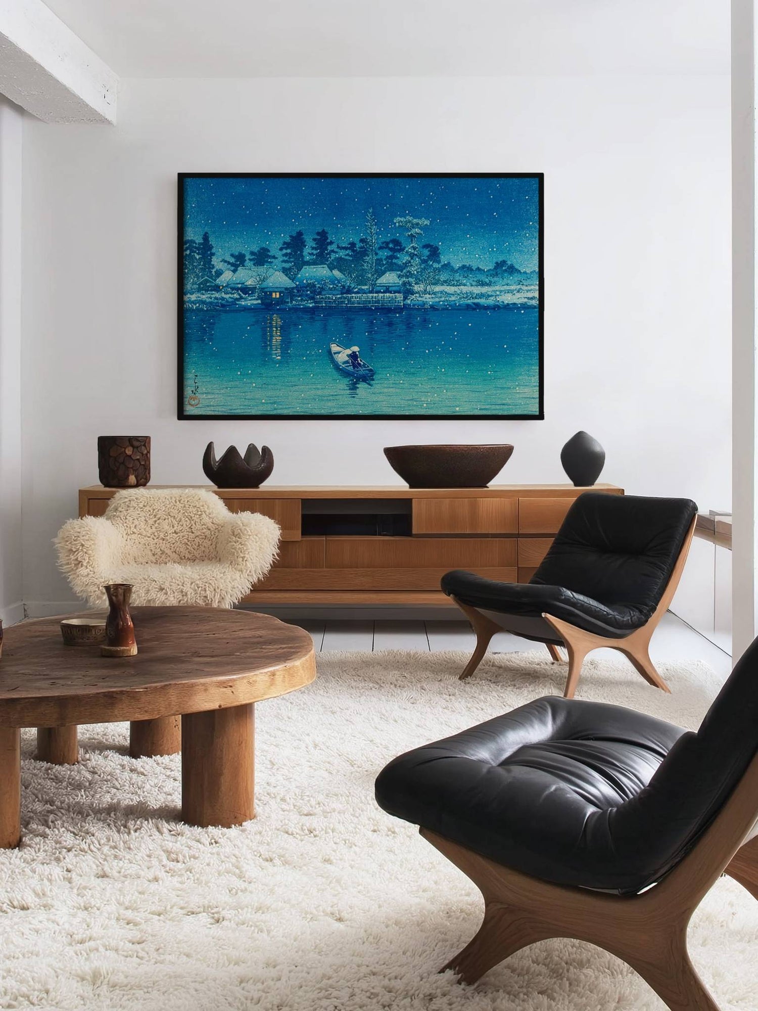 Ein Werk japanischer Meisterkunst – vollendet in Form und Proportion. Der präzise Kiefernholzrahmen verleiht dem Motiv architektonische Klarheit und verankert es im Raum. Eine Ausführung mit Haltung.