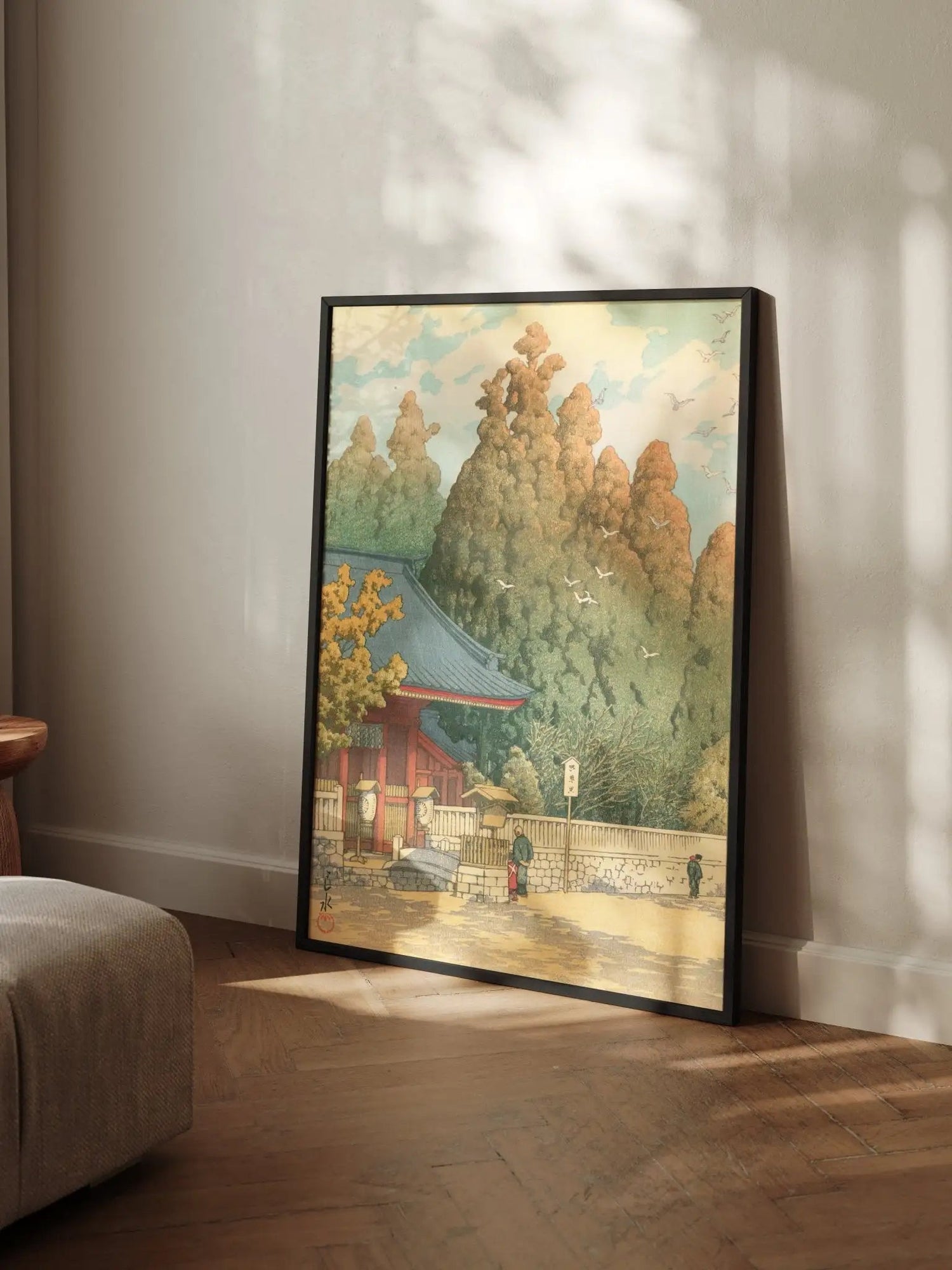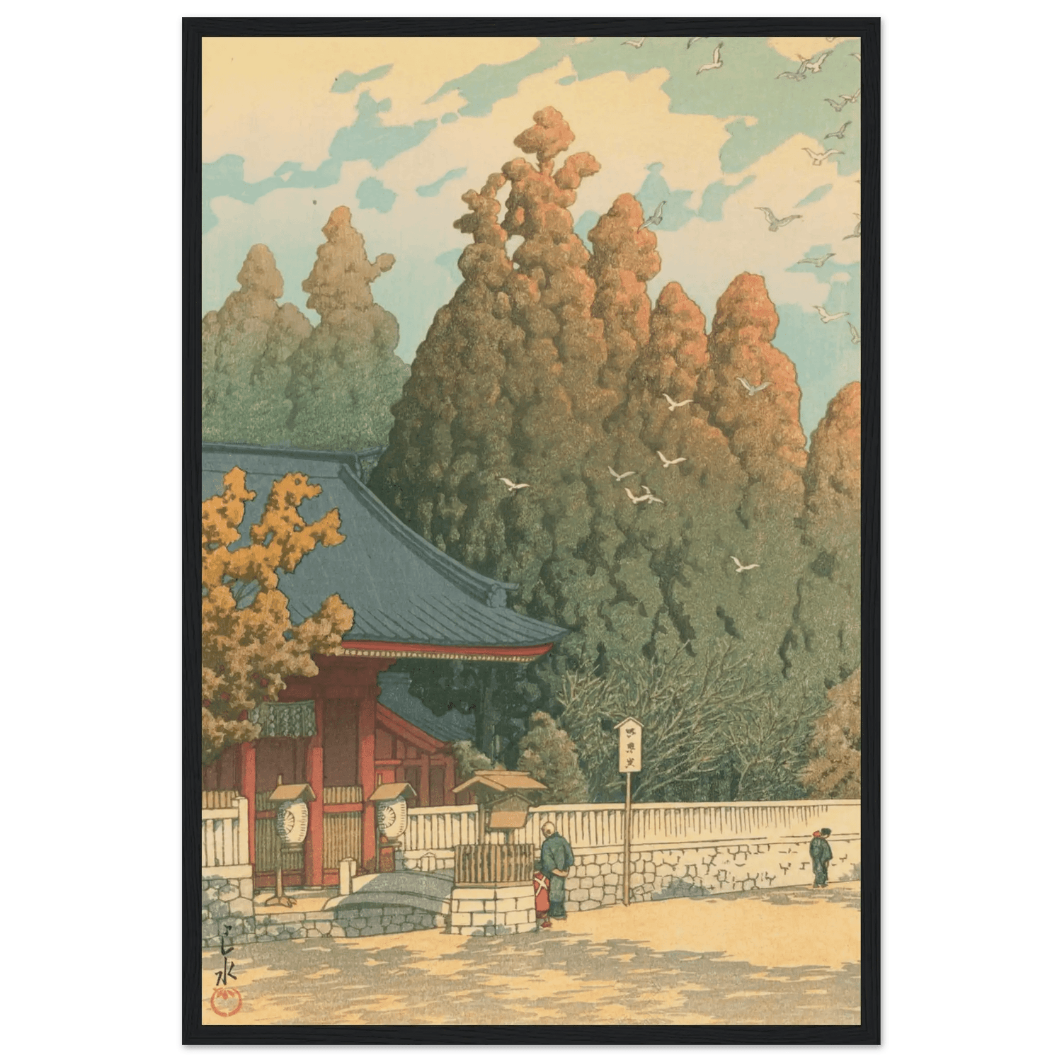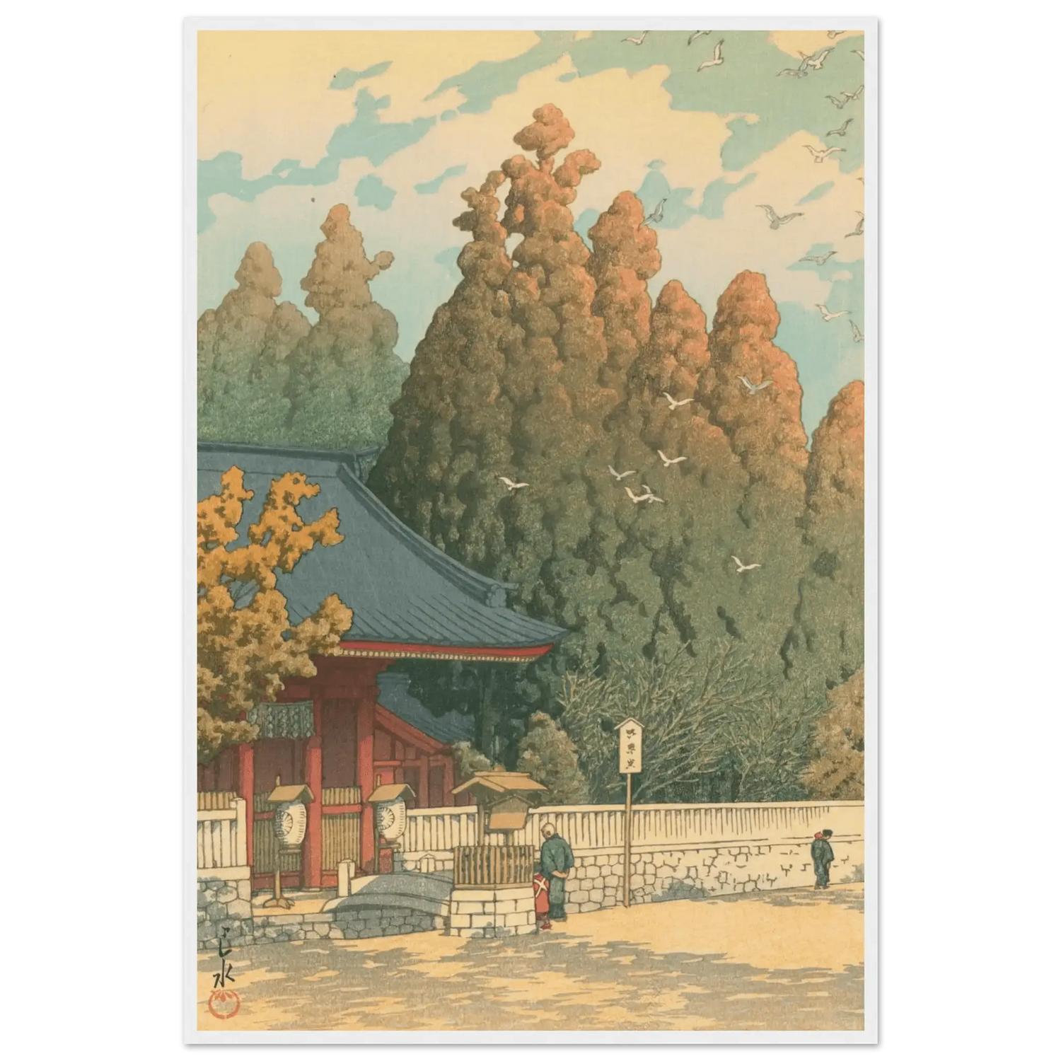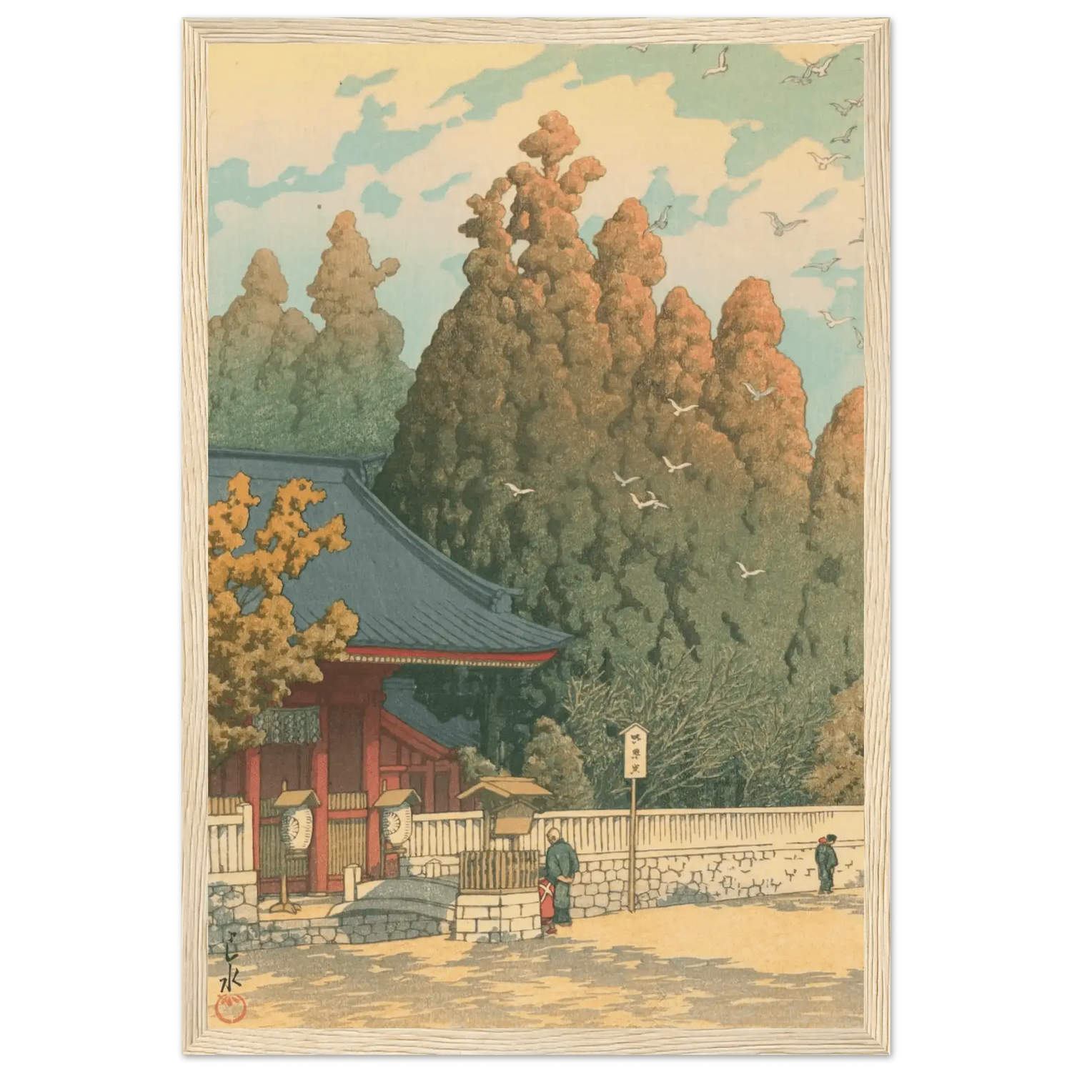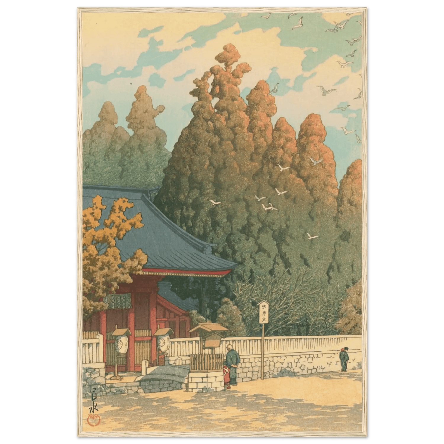 Das goldene Licht eines Herbstnachmittags fällt sanft über das Tempeltor, während Möwen durch die klare Luft ziehen. Zwischen roten Mauern und alten Zedern entfaltet sich eine Atmosphäre stiller Ehrfurcht und Harmonie. Kawase Hasui fängt diesen Moment von flüchtiger Schönheit ein – eine zarte Balance zwischen Natur, Architektur und menschlicher Gegenwart.