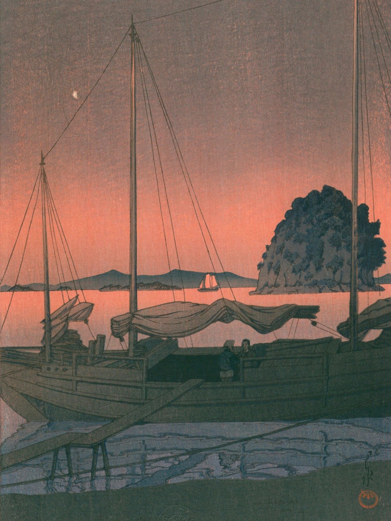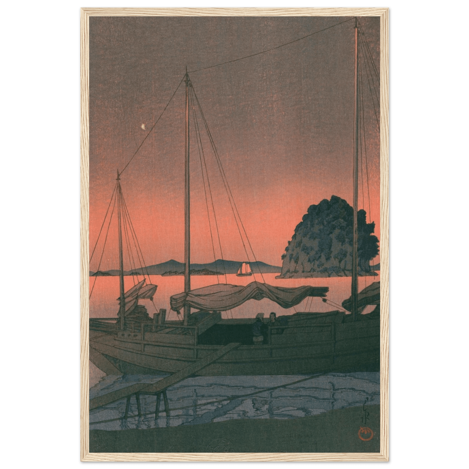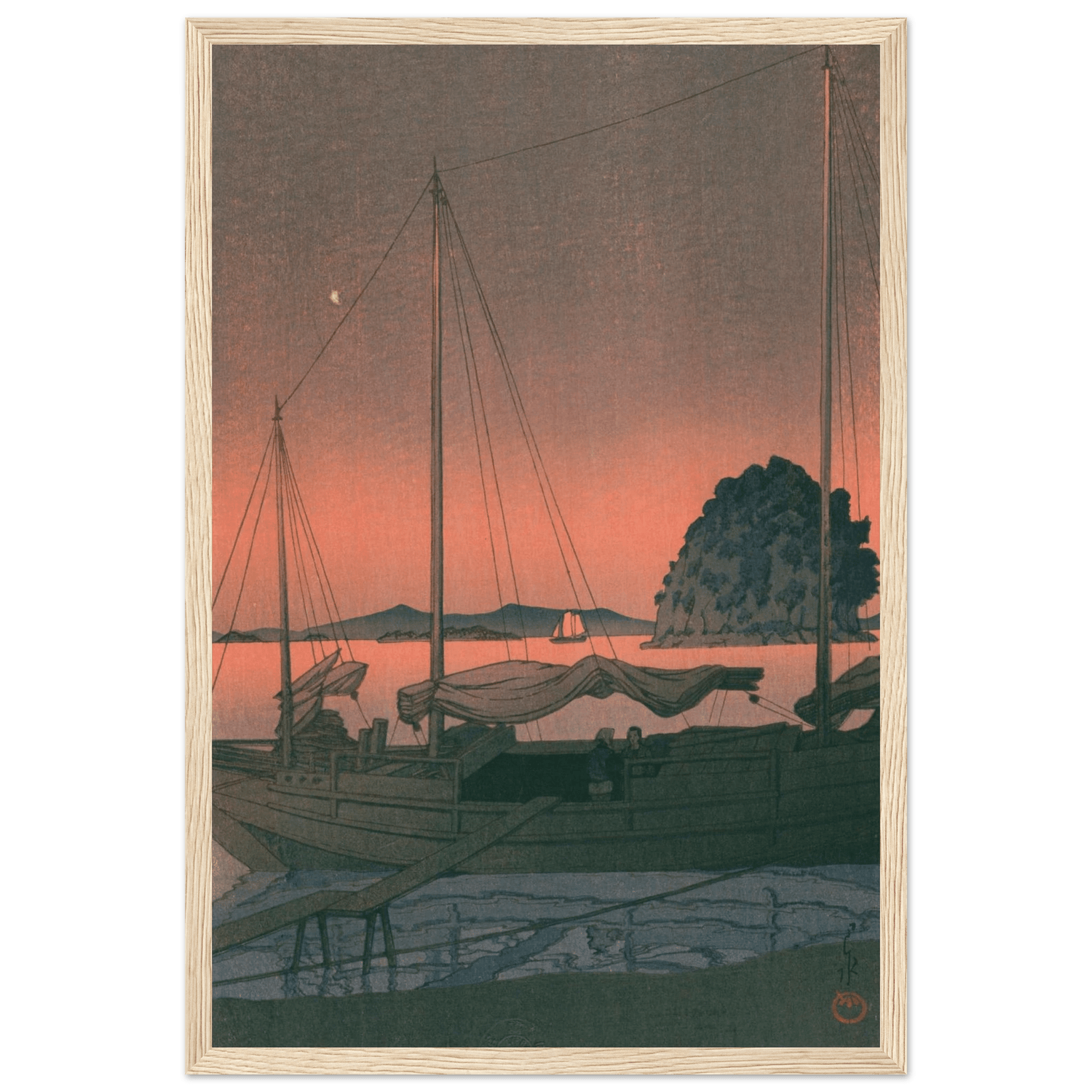 Der Abend senkt sich über den Hafen, und die See leuchtet in einem sanften Rosa, das sich mit dem Schatten der Nacht mischt. Zwei Fischer verweilen auf ihrem Boot, während am Horizont ein Segel im Zwielicht gleitet. Kawase Hasui verwandelt diesen Augenblick in ein stilles Gleichnis aus Licht, Wasser und Erinnerung – die Grenze zwischen Tag und Traum verschwimmt.