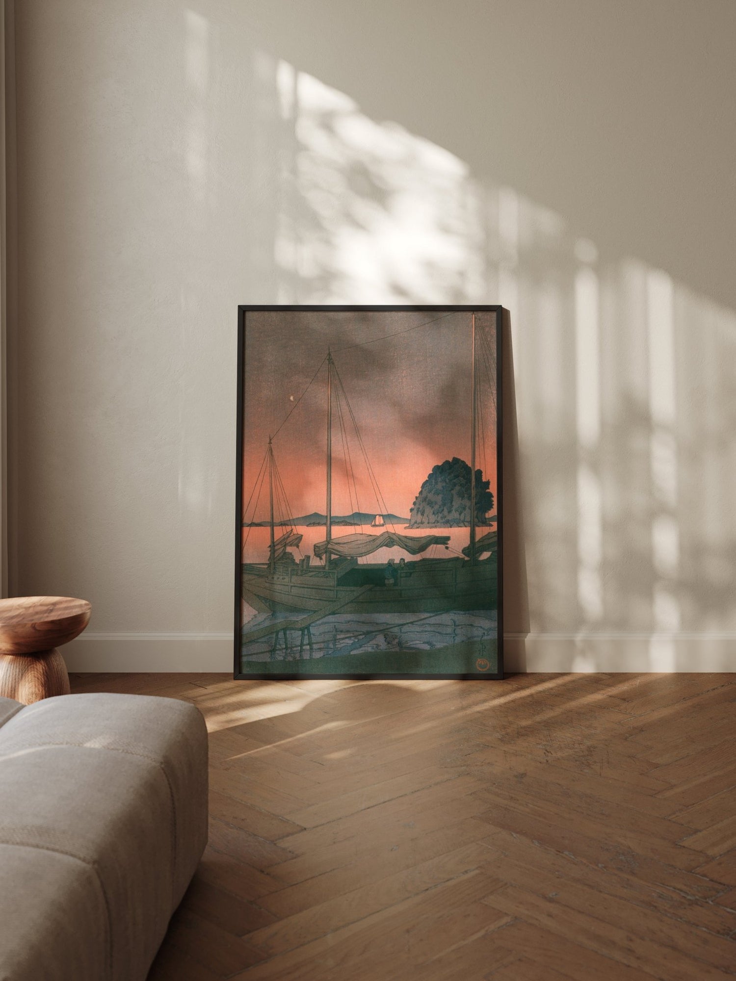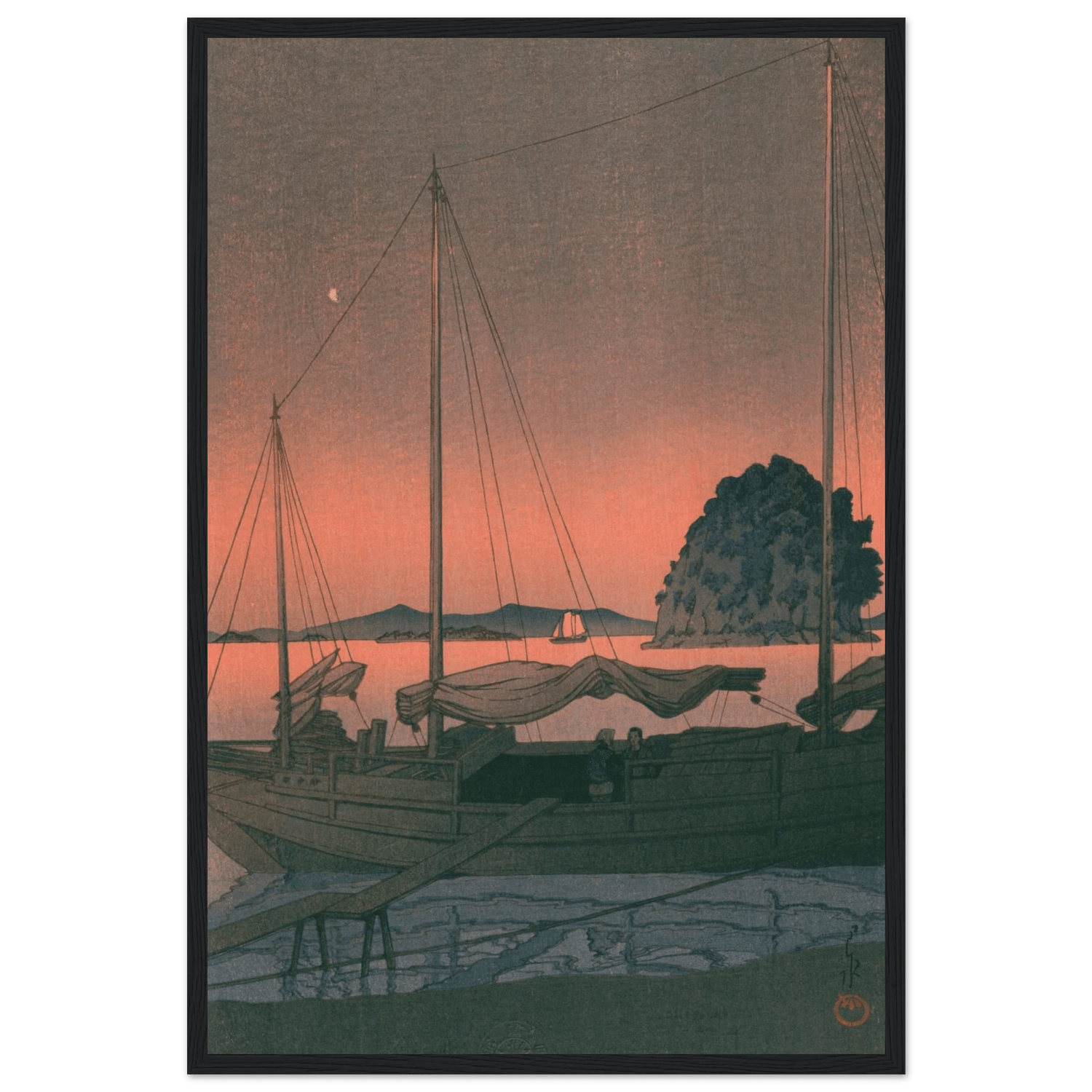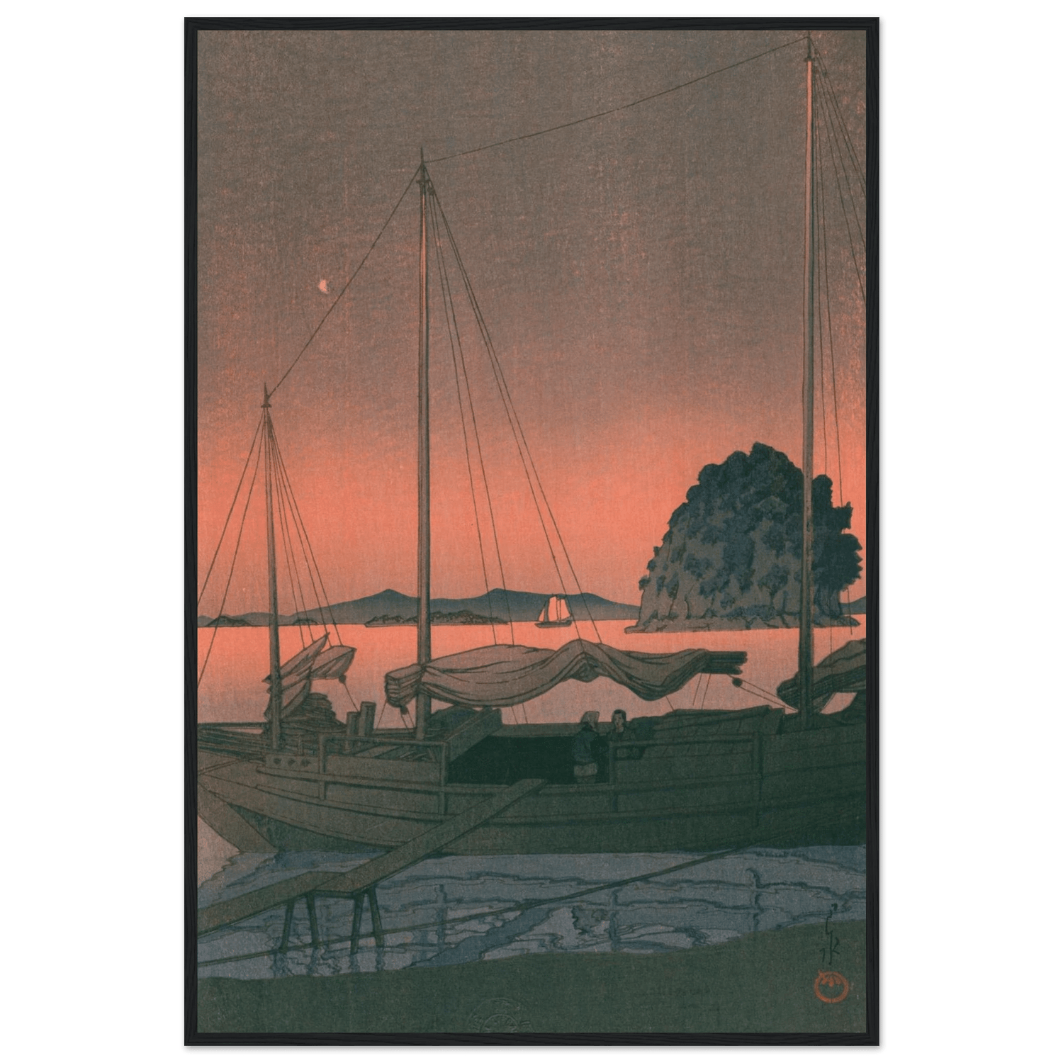 Der Abend senkt sich über den Hafen, und die See leuchtet in einem sanften Rosa, das sich mit dem Schatten der Nacht mischt. Zwei Fischer verweilen auf ihrem Boot, während am Horizont ein Segel im Zwielicht gleitet. Kawase Hasui verwandelt diesen Augenblick in ein stilles Gleichnis aus Licht, Wasser und Erinnerung – die Grenze zwischen Tag und Traum verschwimmt.