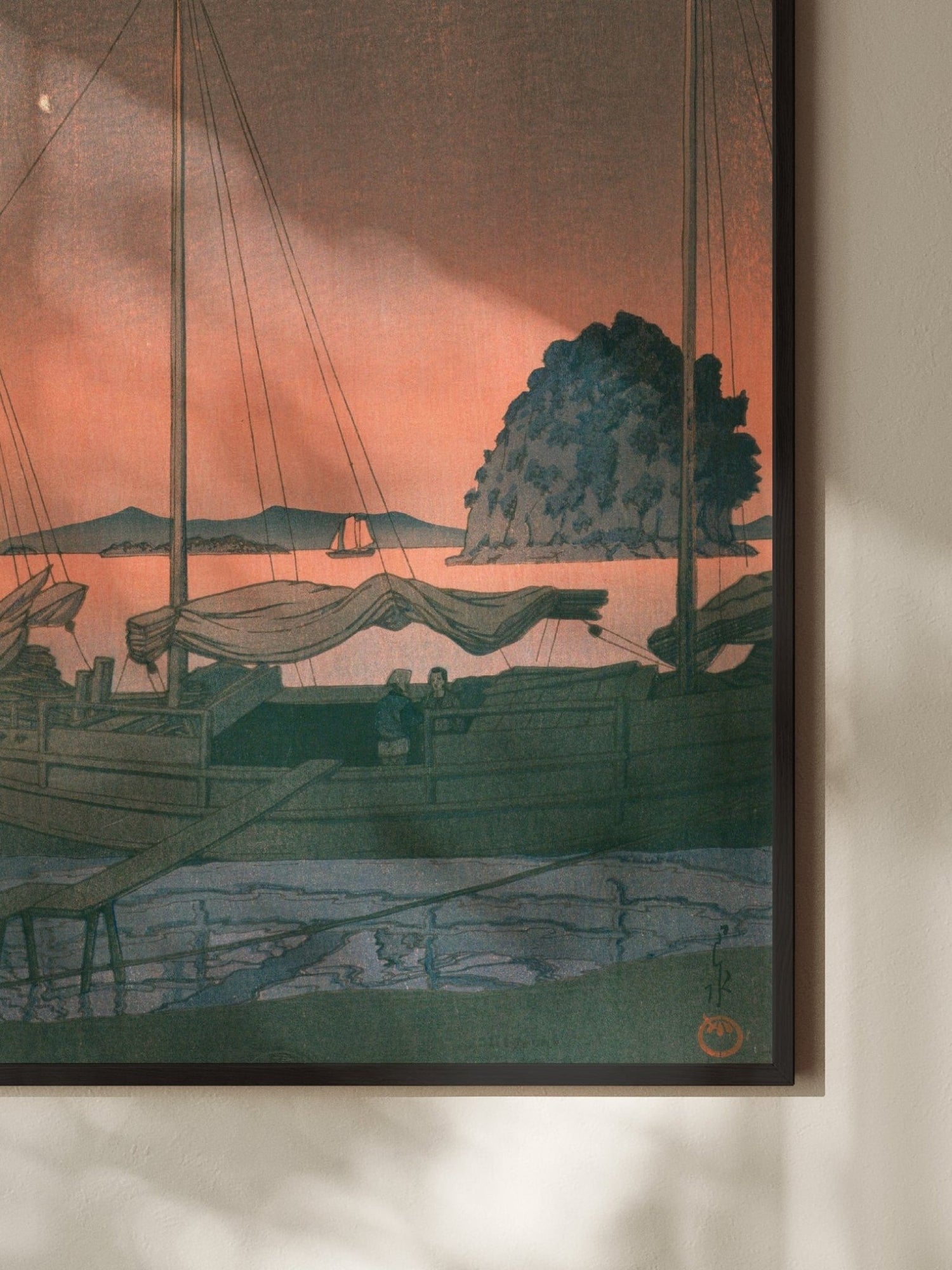 Das Werk stammt aus Hasuis zweiter Holzschnittsammlung und zeigt seine unvergleichliche Fähigkeit, die poetische Ruhe des Meeres in Farbe zu fassen – ein Sinnbild japanischer Sehnsucht und Vergänglichkeit.