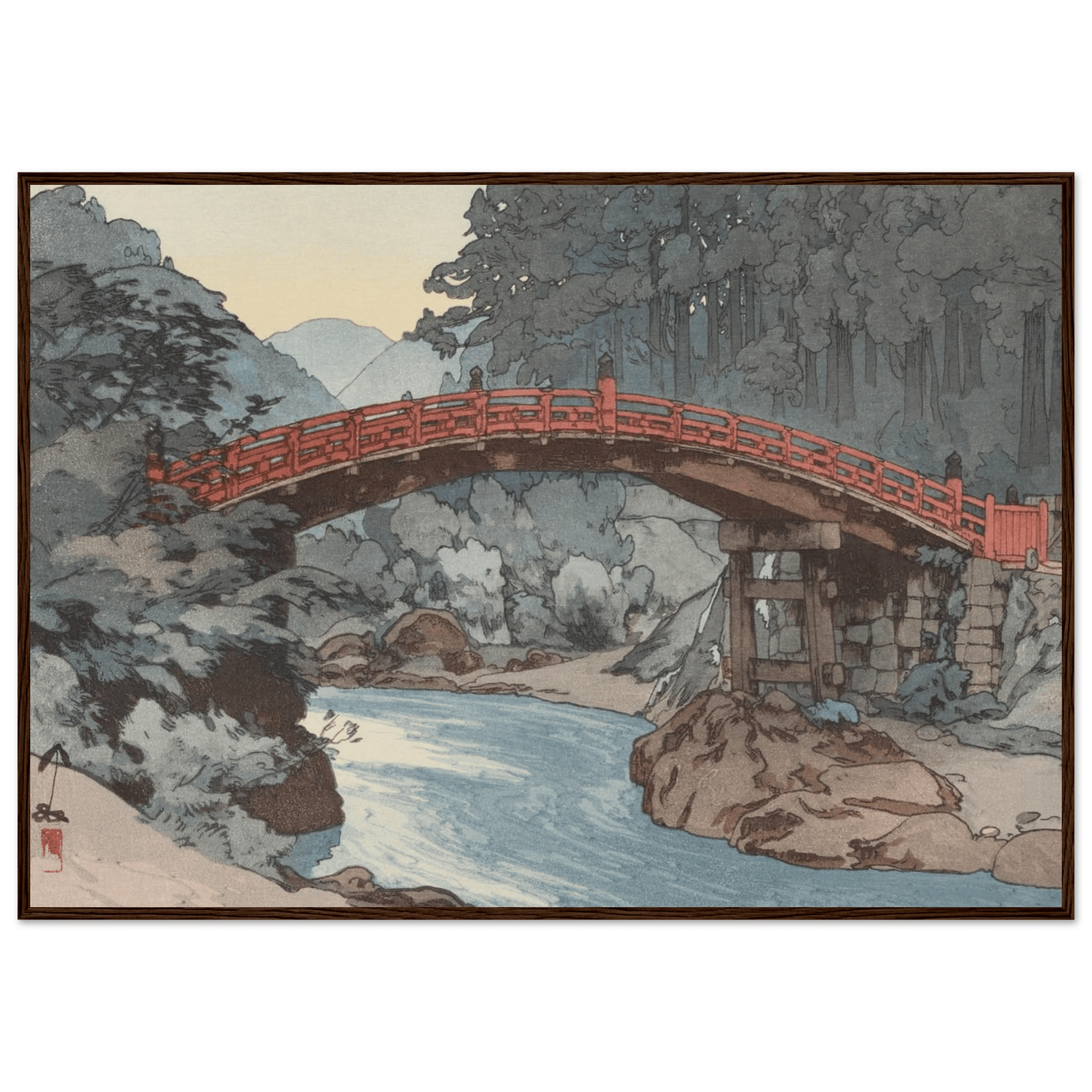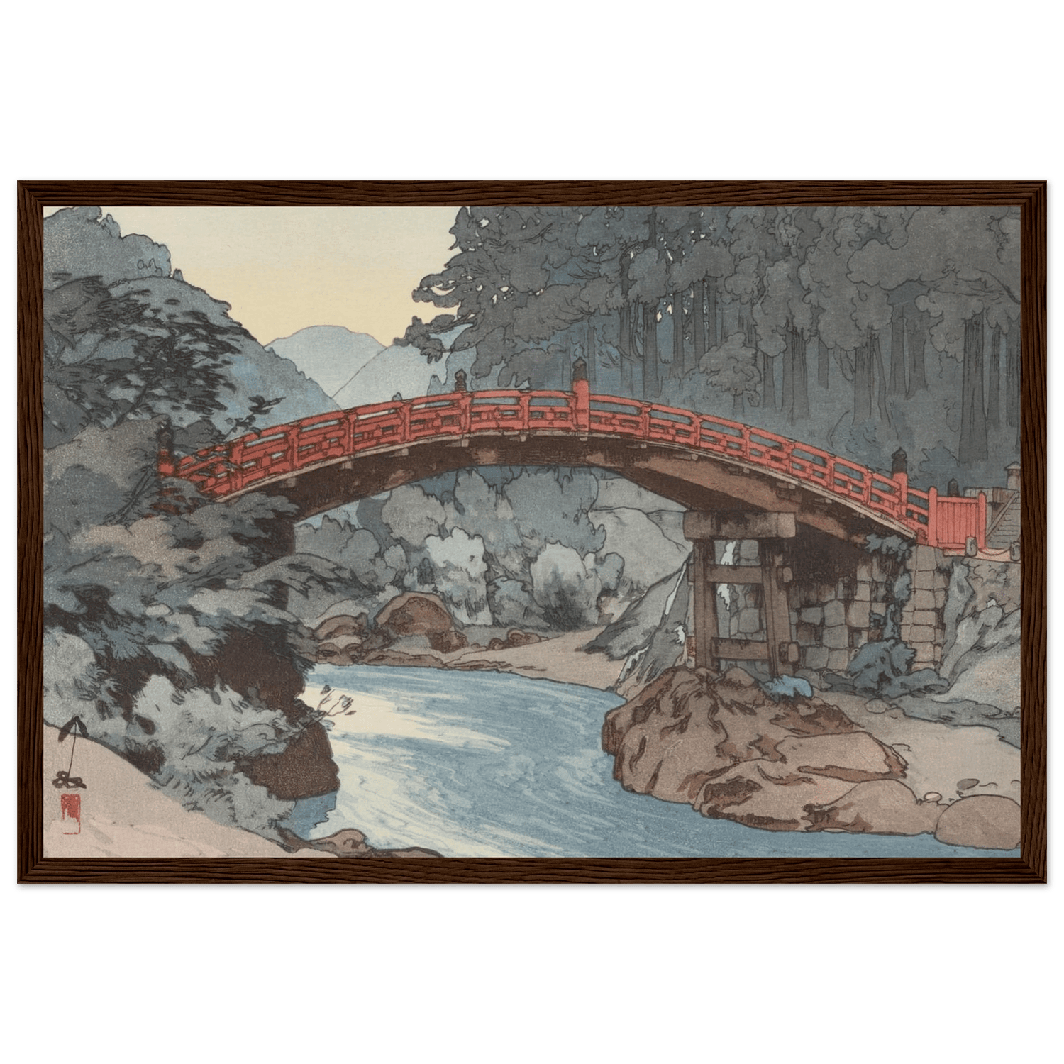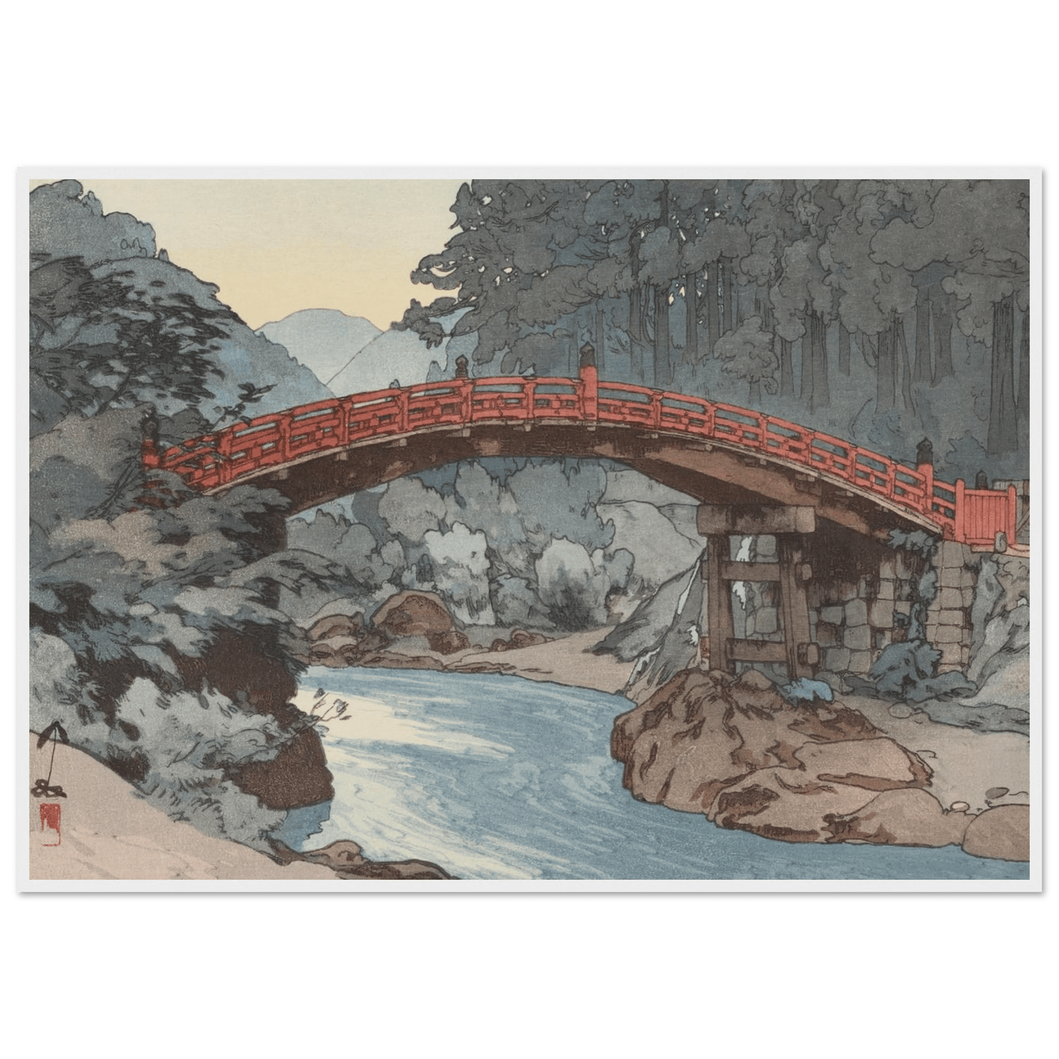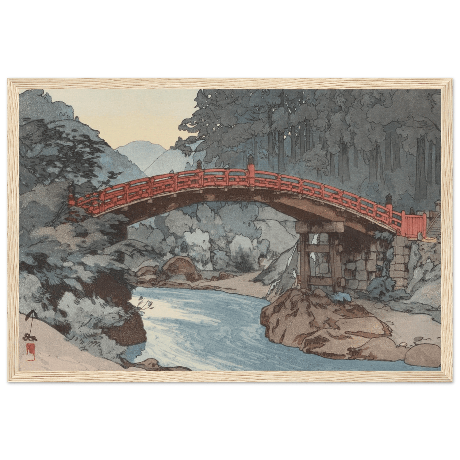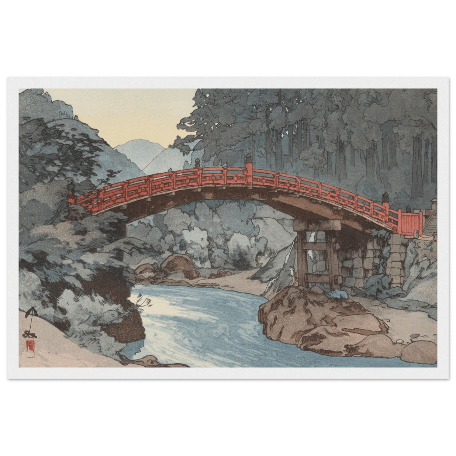Über einem klaren Gebirgsfluss spannt sich die leuchtend rote Brücke wie ein stilles Symbol des Übergangs zwischen Weltlichem und Heiligem. Nebel liegt über den bewaldeten Hängen, und das Licht des Morgens verleiht der Szene eine fast spirituelle Ruhe. Hiroshi Yoshida verbindet in dieser Komposition architektonische Präzision mit meditativer Harmonie – eine Feier japanischer Landschaft und Spiritualität.