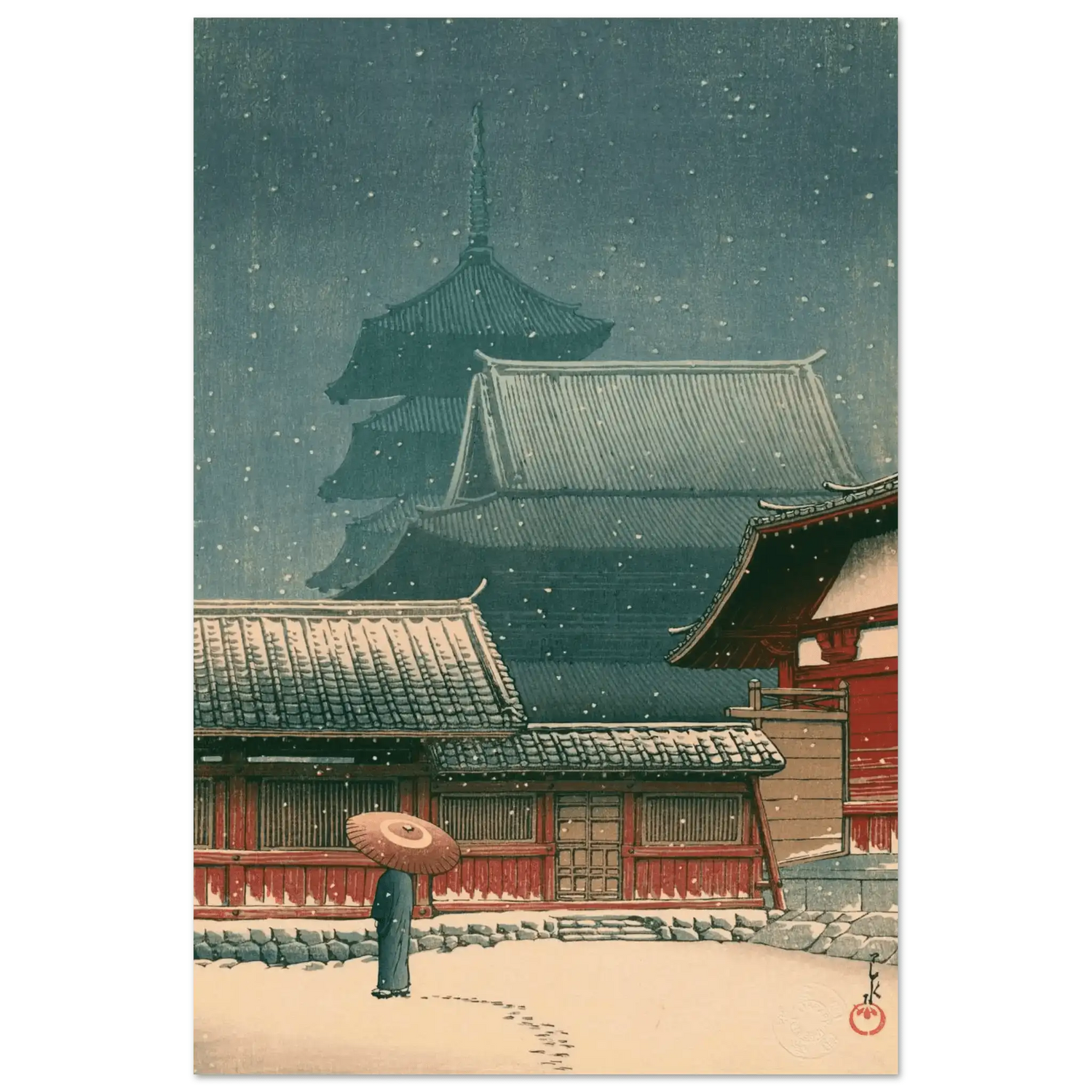 Motiv: Pagode und Tempelgebäude im Schnee, mit einer Figur unter einem Schirm