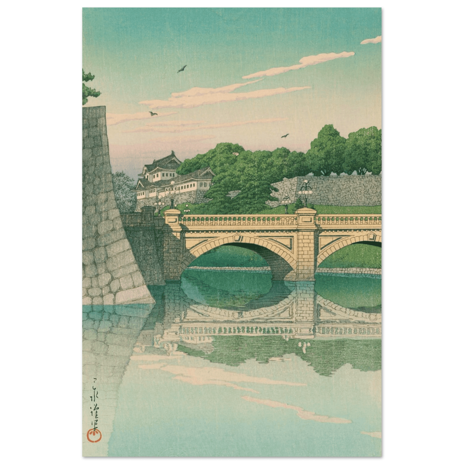 Das Morgenlicht fällt weich auf die steinerne Brücke von Nijūbashi, deren Spiegelbild sich ruhig im klaren Wasser des Grabens verliert. Über den alten Mauern erhebt sich das Schloss von Tokio in stiller Würde, während Vögel über den hellen Himmel ziehen. Kawase Hasui vereint in dieser Komposition Geschichte und Harmonie – ein Moment von Frieden und zeitloser Anmut im Herzen der Hauptstadt.