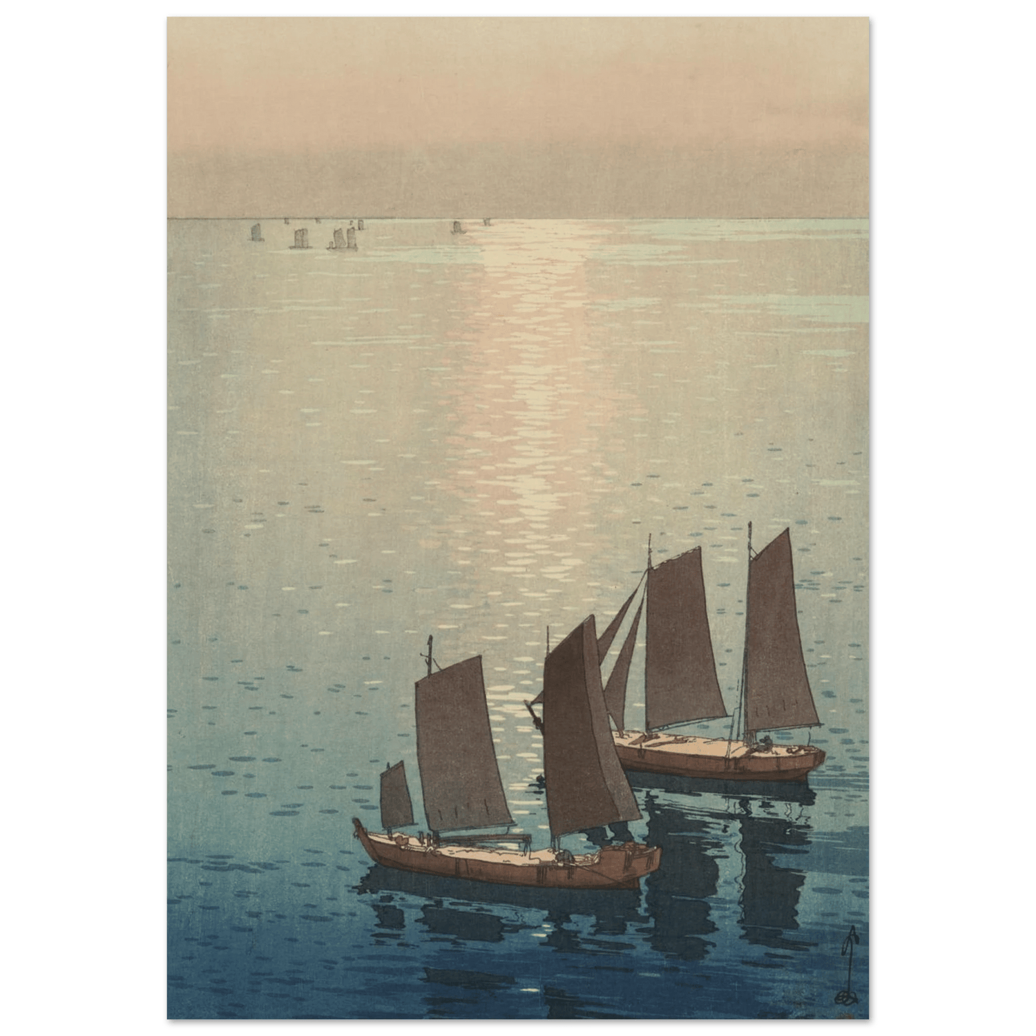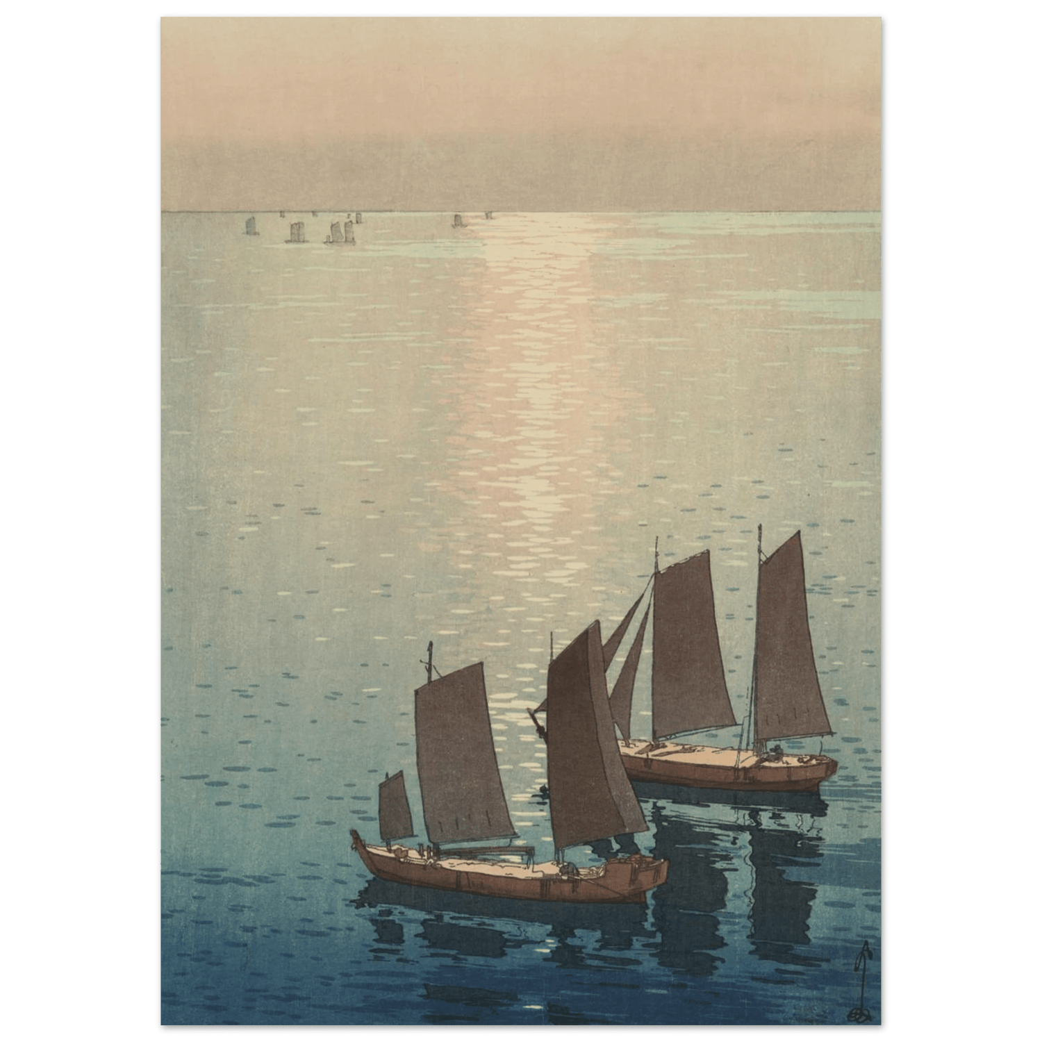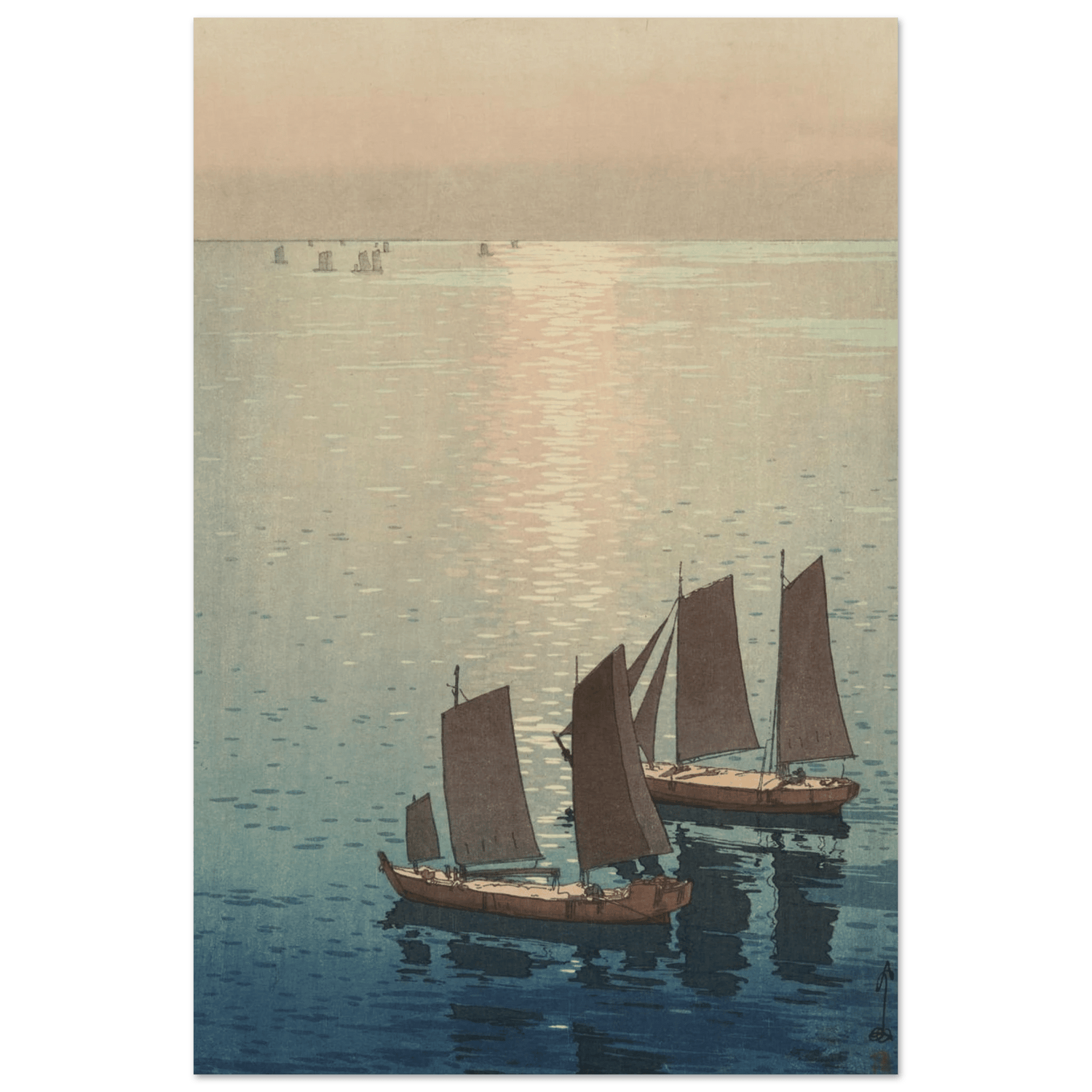Ein sanftes Licht breitet sich über die ruhige Wasserfläche aus, wo die letzten Sonnenstrahlen das Meer in schimmerndes Gold tauchen. Die Segelboote gleiten still über das spiegelnde Wasser, als wären sie Teil eines endlosen Traums zwischen Himmel und Meer. In dieser Komposition fängt Hiroshi Yoshida den Moment ein, in dem Bewegung und Stille ineinander übergehen – eine Meditation über Licht, Zeit und Vergänglichkeit.
