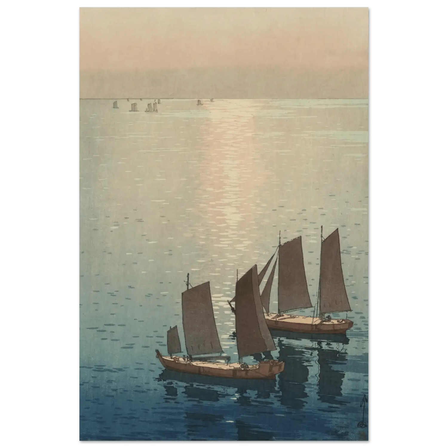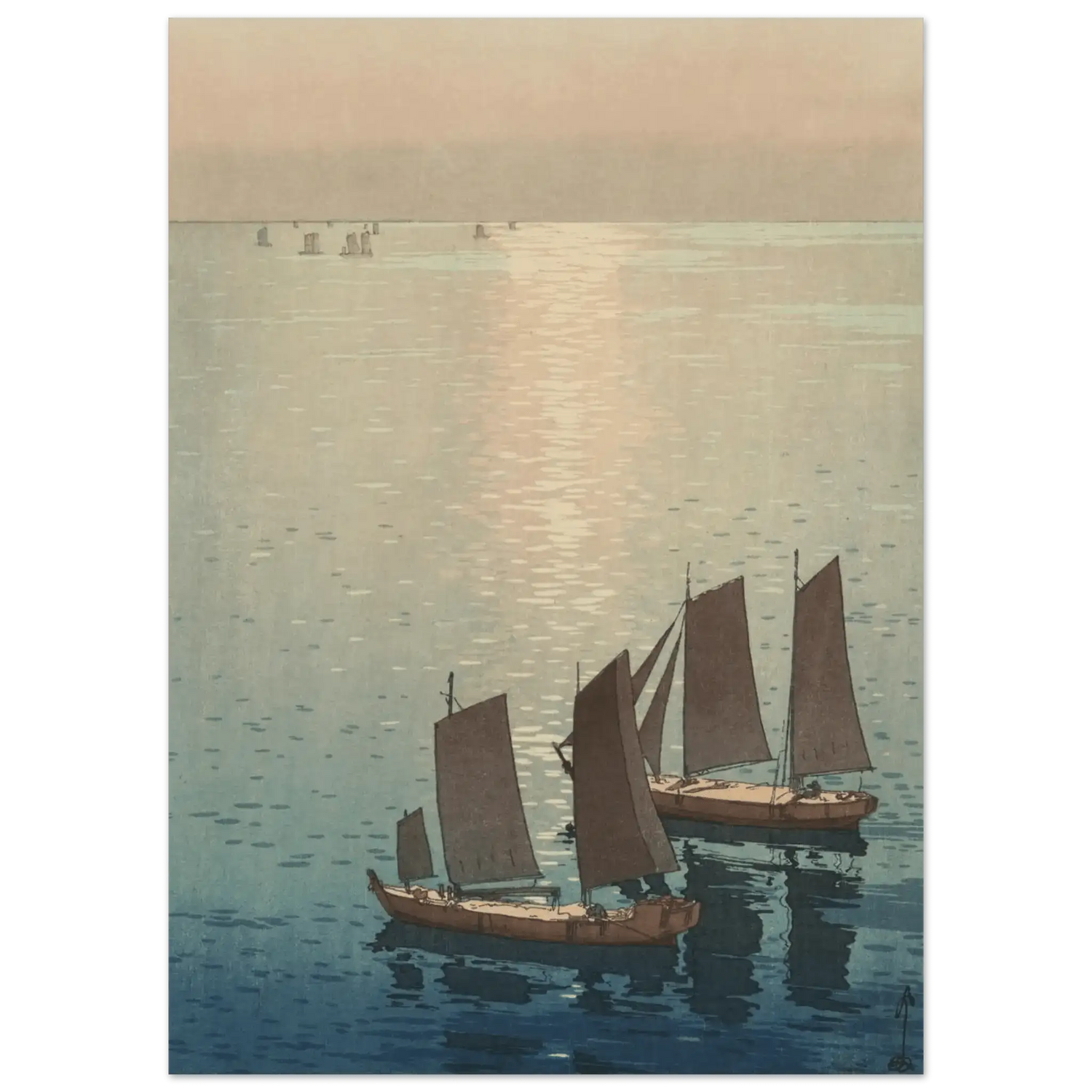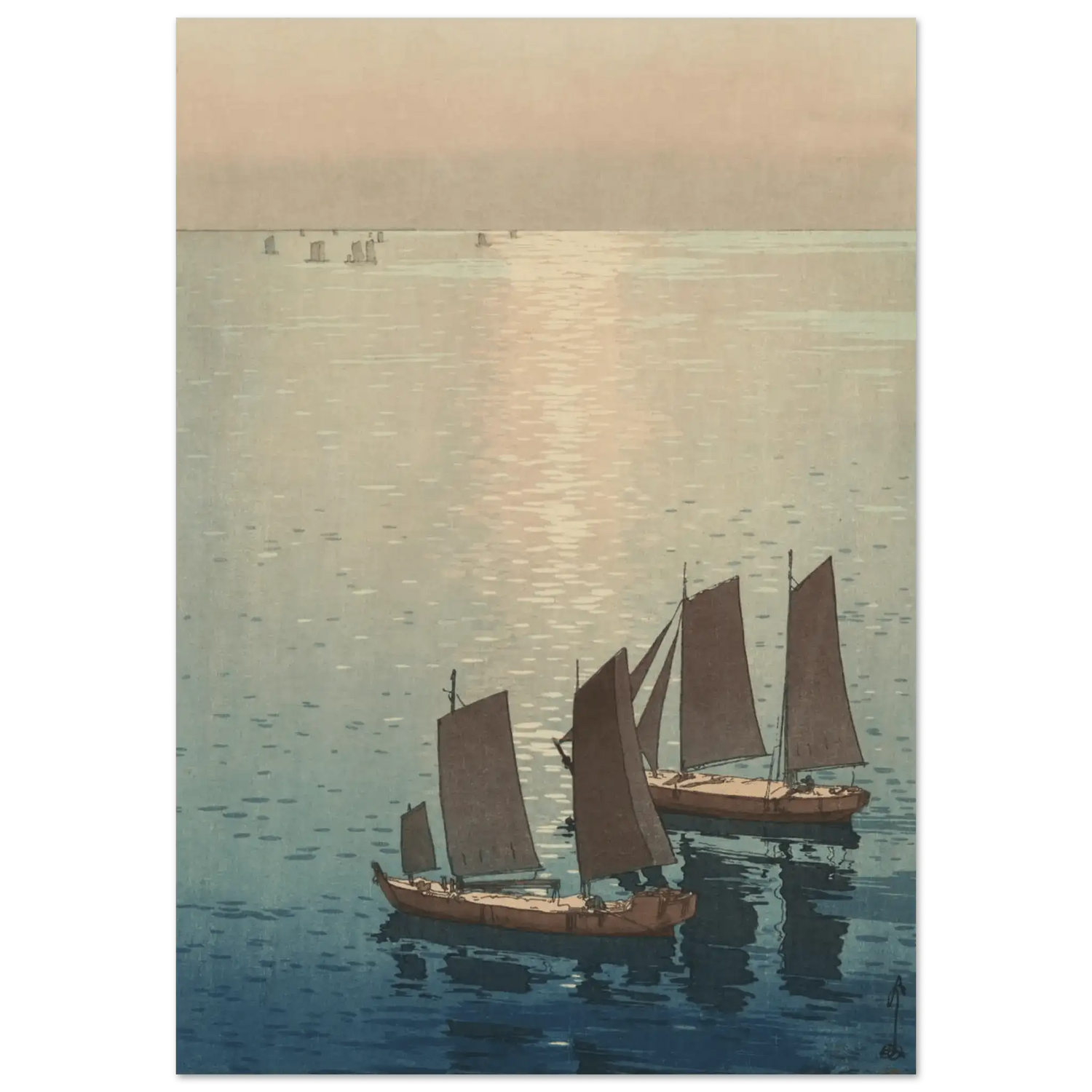 Ein sanftes Licht breitet sich über die ruhige Wasserfläche aus, wo die letzten Sonnenstrahlen das Meer in schimmerndes Gold tauchen. Die Segelboote gleiten still über das spiegelnde Wasser, als wären sie Teil eines endlosen Traums zwischen Himmel und Meer. In dieser Komposition fängt Hiroshi Yoshida den Moment ein, in dem Bewegung und Stille ineinander übergehen – eine Meditation über Licht, Zeit und Vergänglichkeit.