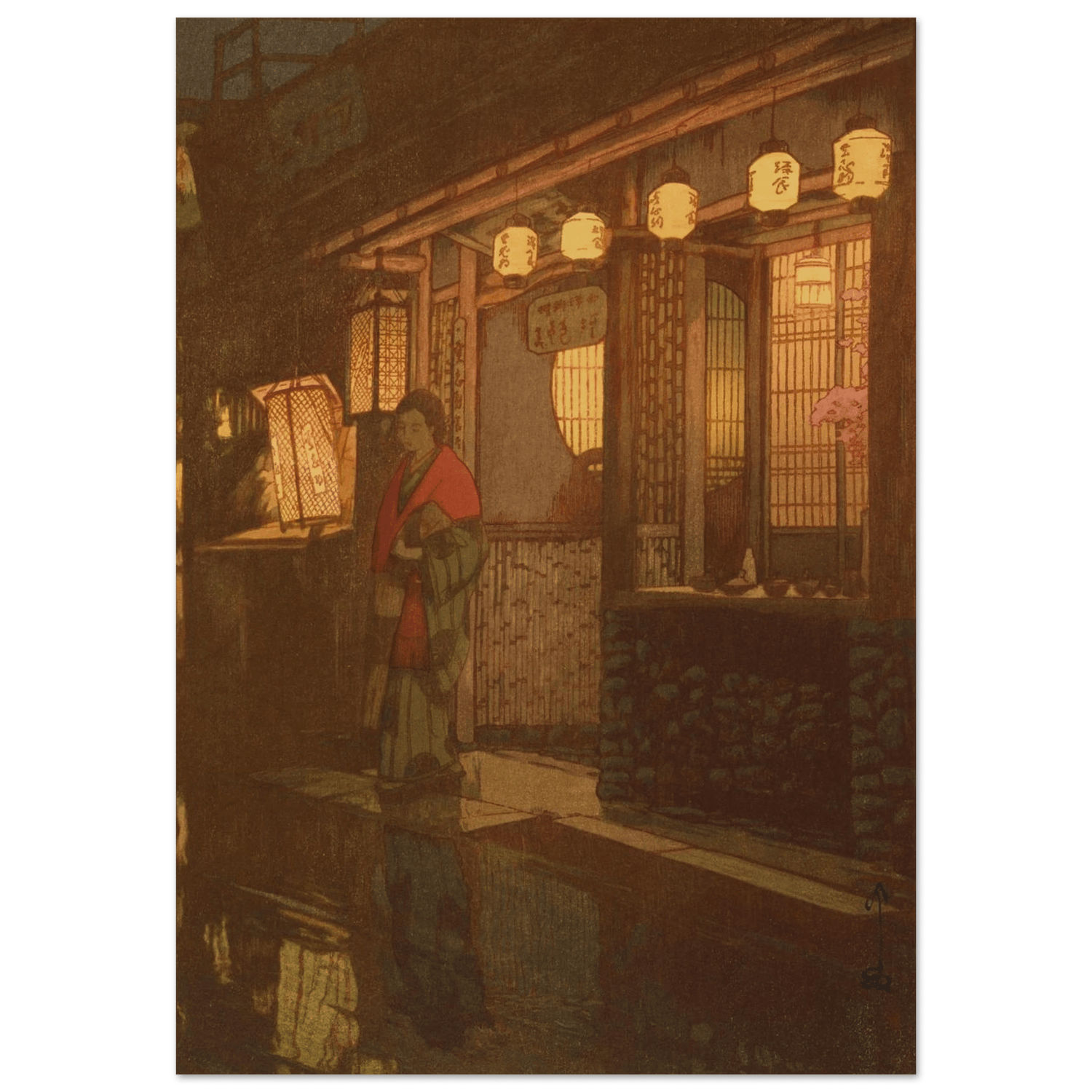 Sanftes Laternenlicht taucht die Szene in warmes Gold und Rot, während sich das Pflaster im Regen spiegelt. Eine Frau im Kimono steht vor einem kleinen Restaurant – ein flüchtiger Moment des Alltags, eingefangen mit stiller Würde und feinem Gespür für Atmosphäre. Hiroshi Yoshida lässt Licht und Schatten miteinander verschmelzen, sodass die Nacht zu atmen scheint – zwischen Intimität und Vergänglichkeit.