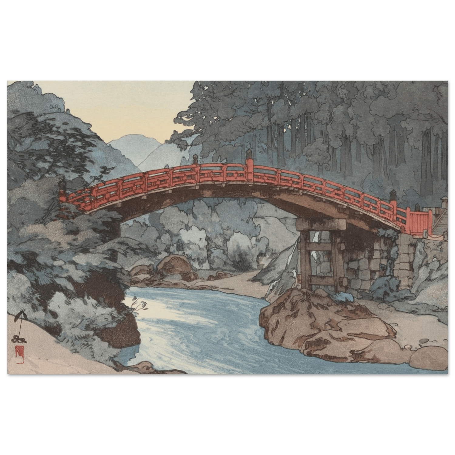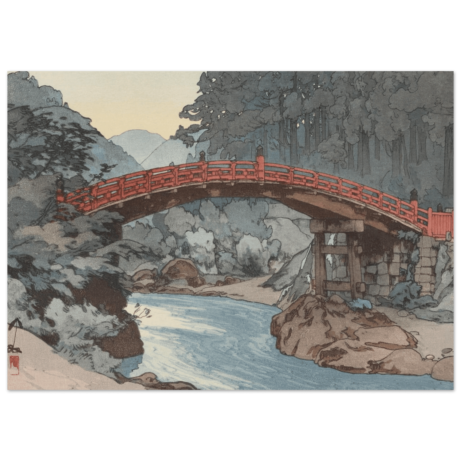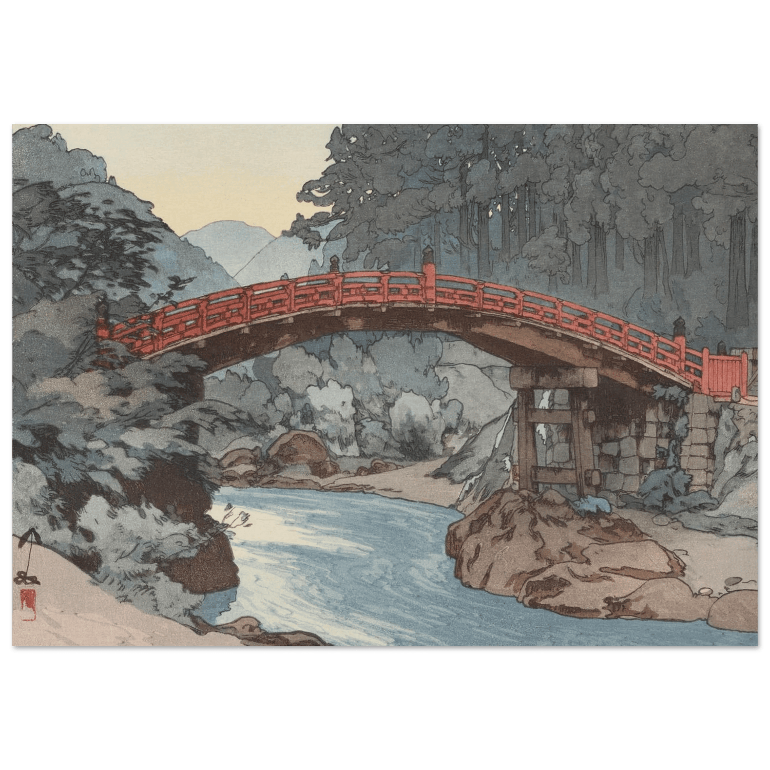 Über einem klaren Gebirgsfluss spannt sich die leuchtend rote Brücke wie ein stilles Symbol des Übergangs zwischen Weltlichem und Heiligem. Nebel liegt über den bewaldeten Hängen, und das Licht des Morgens verleiht der Szene eine fast spirituelle Ruhe. Hiroshi Yoshida verbindet in dieser Komposition architektonische Präzision mit meditativer Harmonie – eine Feier japanischer Landschaft und Spiritualität.