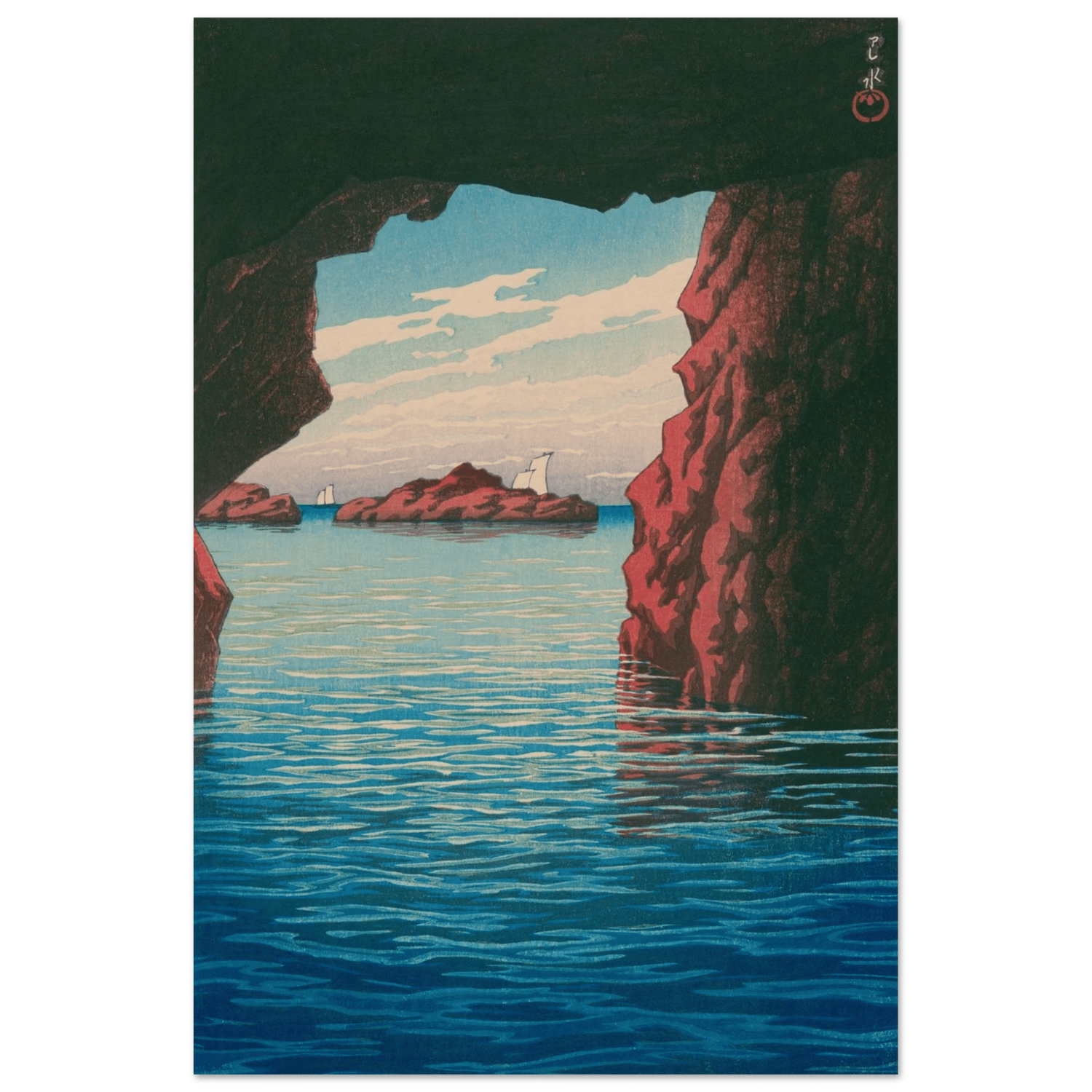 Durch den Schatten einer Meeresgrotte öffnet sich der Blick auf das glitzernde Blau der See, wo weiße Segel zwischen rötlichen Felsen treiben. Das Licht des Himmels bricht sich in sanften Schichten von Türkis und Purpur – eine Komposition von seltener Klarheit und Ruhe. Kawase Hasui fängt hier die Stille eines Sommermorgens ein, in dem Meer, Stein und Licht in vollkommener Harmonie verschmelzen.